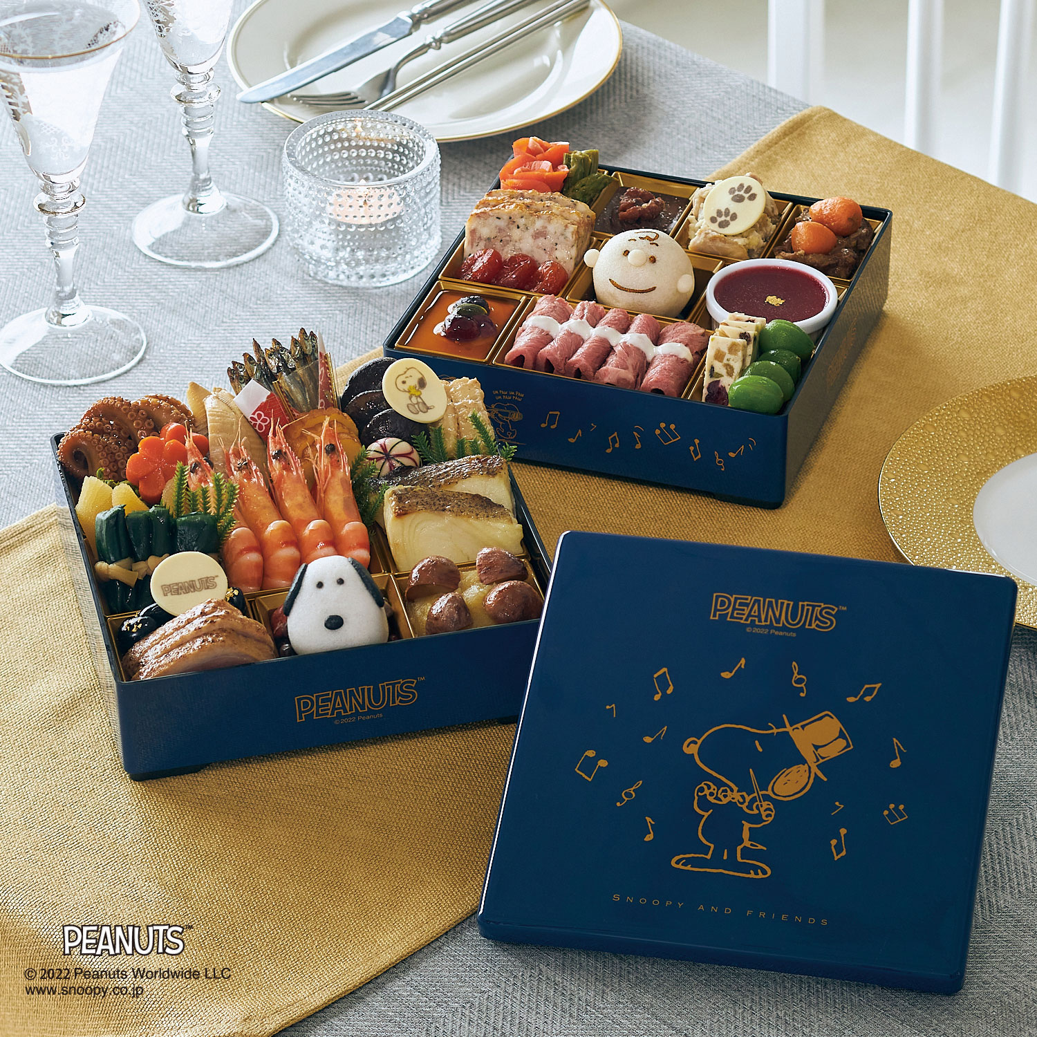 こちらの商品はスヌーピーのイラストが可愛いシックな紺色の豪華な和洋折衷二段重です。